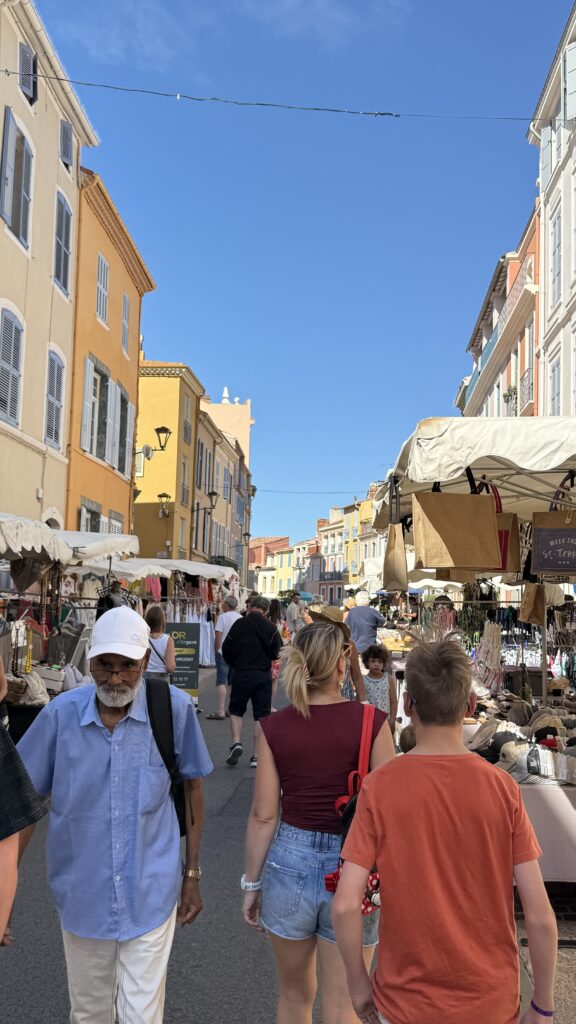 Woensdag is marktdag in Fréjus. Ik had visioenen van kleurrijke stalletjes vol fruit, kruiden, jurken en olijven. In realiteit: drie tomaten, vijf kraampjes (oké, misschien iets meer) en één geitenkaas die me aankeek. Gelukkig maakte het historische centrum veel goed.
