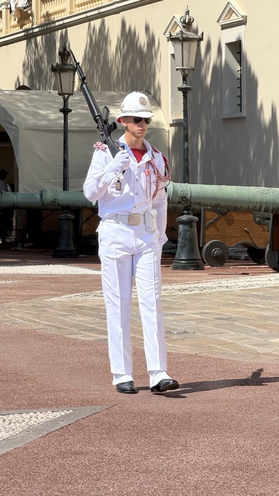 Om 11u55 is er aan het prinselijk paleis van Monaco de traditionele wissel van de wacht. Je geraakt er niet zomaar: heel wat trappen en een stevige wandeling brengen je naar boven, maar onderweg passeer je pittoreske straatjes vol leuke winkeltjes en uitzichtpunten waar je een postkaart zou kunnen uithuilen van geluk. Wij waren ruim op tijd vertrokken om zowel de klim als de wachttijd aan te kunnen. Twintig minuten voor aanvang zochten we een goed plekje. Klokslag 11u55: tromgeroffel, bevelen, stappen, wapengekletter – het hele schouwspel duurde exact tien minuten. Kort, ceremonieel en de moeite waard. En daarna: alles wat omhoog gaat, moet ook weer naar beneden. Op naar lunch!
