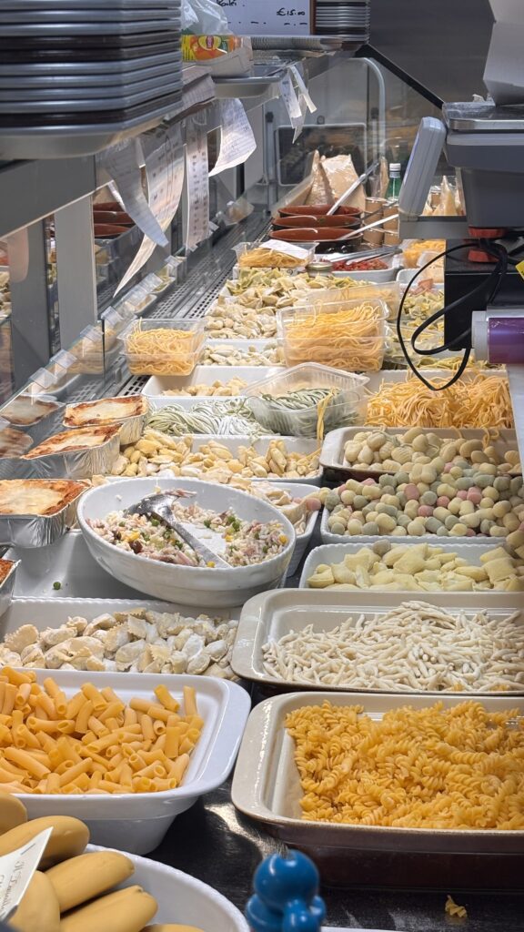 Voor lunch gingen we naar Maison de Pâtes in de overdekte foodmarkt Marché de la Condamine, helemaal onderaan de trappen van het paleis. Eén blik op het aanbod en we waren verkocht: verse pasta’s met toppings naar keuze, en dat alles voor prijzen die je zelfs in België amper nog tegenkomt. Authentiek, snel, vriendelijk én een portie waar je u tegen zegt. De foodmarkt zelf is een fijne mix van locals en toeristen, met allerlei eetstandjes en gezellige tafeltjes. Op tijd komen is geen overbodige luxe wil je een plekje aan tafel bemachtigen. En niet onbelangrijk: Doorheen Monaco vind je kraaknette openbare toiletten (bonuspunten!).